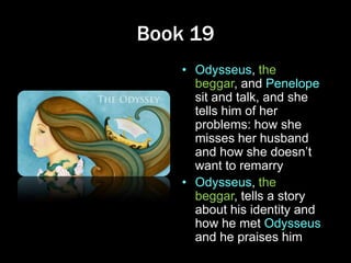 Characters See a complete list of the. Book 1 Book 2 Book 3 Book 4 Book 5 Book 6 Book 7 Book 8 Book 9 Book 10 Book 11 Book 12 Book 13 Book 14 Book 15 Book 16 Book 17 Book 18 Book 19 Book 20 Book 21 Book 22 Book 23 Book 24 Themes All Themes Fate the Gods and Free Will Piety Customs and Justice Cunning Disguise and Self-Restraint Memory and Grief Glory and Honor. A detailed description and in-depth analysis of Penelope in The Odyssey.